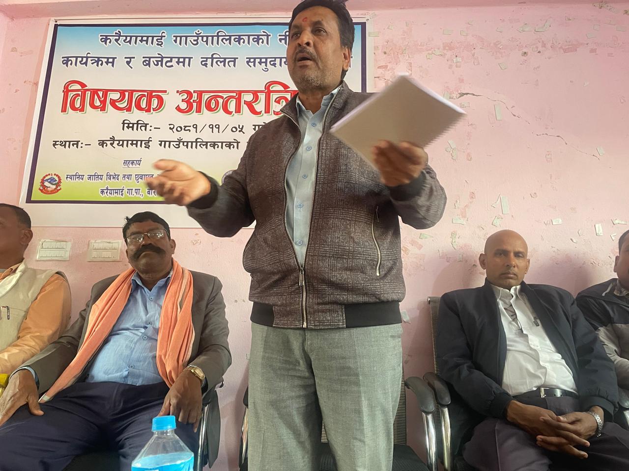 करैयामाई नगरपालिकाका दलित अधिकारकर्मीहरूले आगामी बजेट दलितमैत्री हुनुपर्नेमा जोड दिएका छन्। पालिकाको सभाहलमा आयोजित कार्यक्रममा विभिन्न वक्ताहरूले दलित समस्या बजेट प्राथमिकतामा नपरेकोमा चिन्ता व्यक्त गरे। स्थानीय दलित अगुवा राजेश पासवानका अनुसार संविधानमै दलितहितका प्रावधान थोरै रहेको छ, त्यसमा पनि पालिकाले कार्यान्वयन नगरेको गुनासो छ।