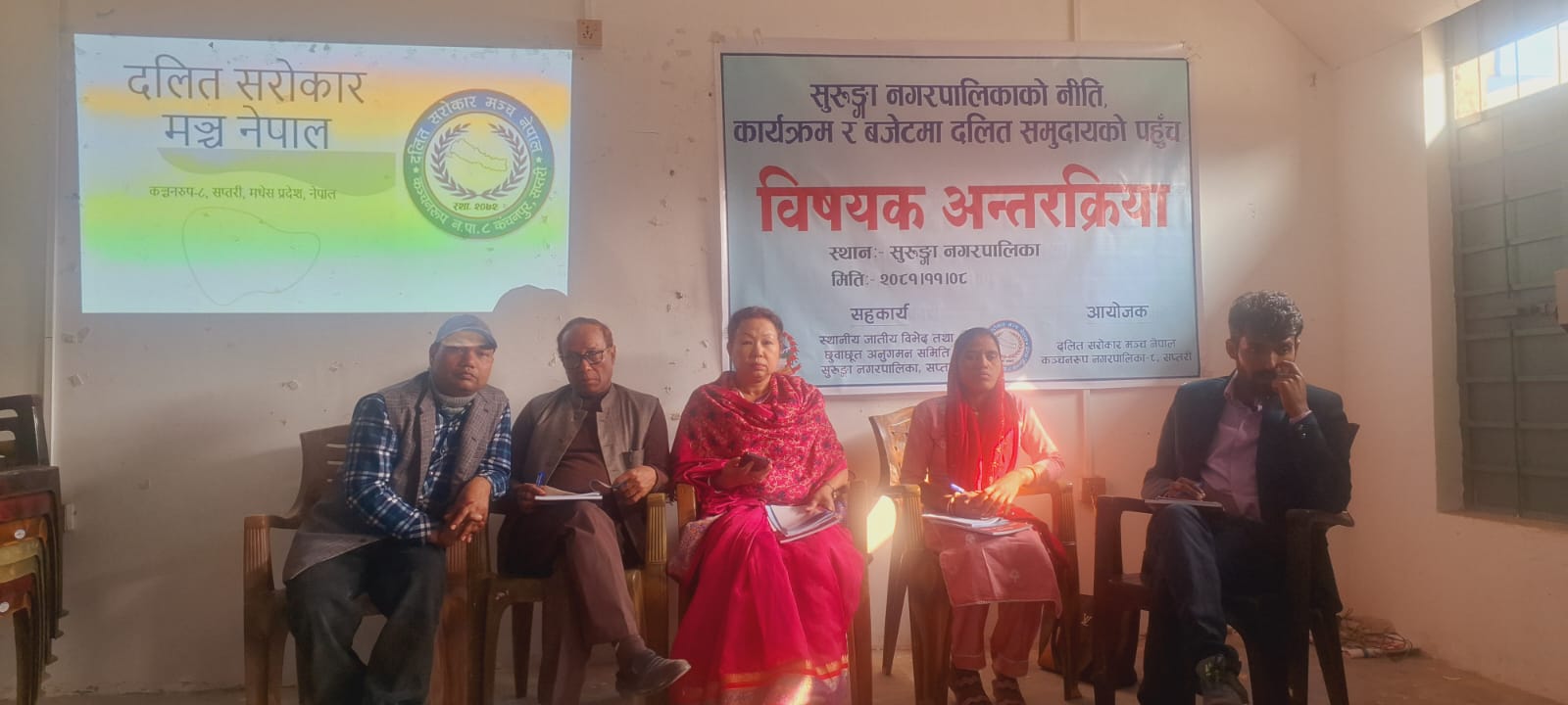दलित सरोकार मञ्च नेपालको आयोजनामा भएको कार्यक्रममा प्रमुख प्रशासकीय अधिकृत सुनिलकुमार पासवानले अध्ययनले नीति निर्माणमा सहयोग पुर्याउने बताए। दलित अधिकारकर्मी दिपेन्द्र पासवानले दलित सशक्तीकरणका लागि बजेट अपुग रहेको गुनासो राखे भने, इन्द्र रामले दलित समुदायलाई उठिबास गराउने प्रवृत्ति रोक्न पालिकाले ठोस कदम चाल्नुपर्ने बताए।