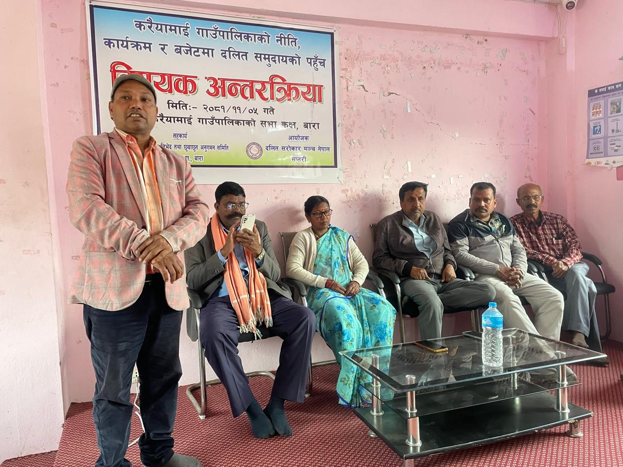 करैयामाई गाउँपालिकाका अध्यक्ष शम्भुप्रसाद यादवले दलितका लागि पर्याप्त बजेट छुट्याउन नसके पनि सुरुवात गरिएको बताए। कार्यक्रमका निष्कर्ष प्रस्तुत गर्दै दलित सरोकार मञ्चका मनीष कोइरालाका अनुसार पालिकाले दलित समुदायका लागि विनियोजन गरेको बजेट अझै अपुग रहेको देखिन्छ। कार्यक्रममा ६० जनाभन्दा बढी सहभागी थिए। यसअघि मञ्चले सप्तरीको कञ्चनरुप नगरपालिका, सिरहाको धनगढीमाई नगरपालिका लगायतका स्थानमा पनि छलफल गरेको थियो।